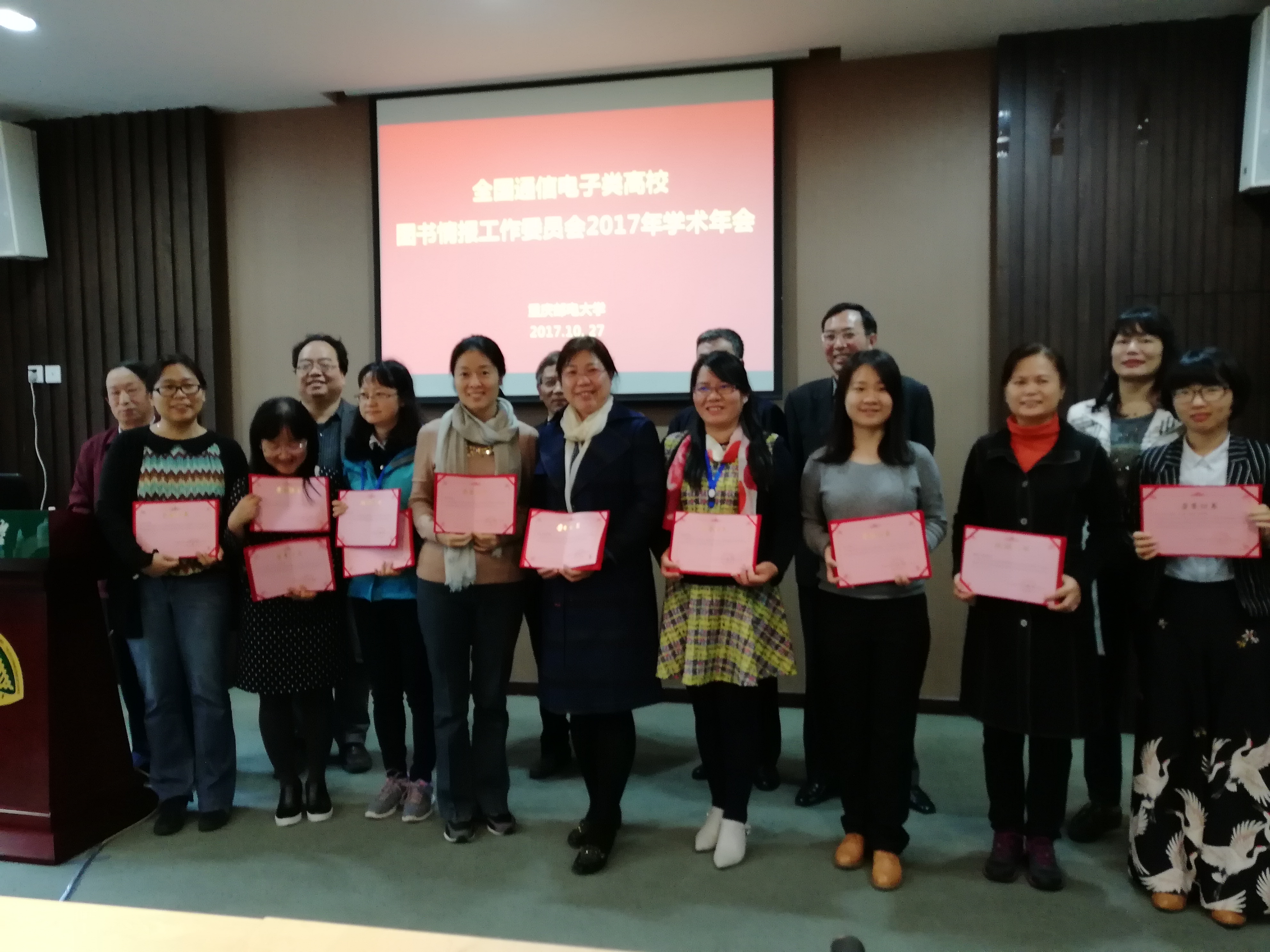 全国通信电子类高校图书情报工作委员会2017年学术年会于10月26日至29日在重庆邮电大学召开,来自重庆邮电大学、北京邮电大学、电子科技大学、西安电子科技大学、南京邮电大学、北京信息科技大学、桂林电子科技大学、杭州电子科技大学、西安邮电大学9所高校图书馆领导及代表共50余人参加会议。我校图书馆杜昊、童梅莉和冯小桓老师在本次征文中荣获一等奖。苑世芬、周同、赵双和陈国兰老师荣获二等奖。