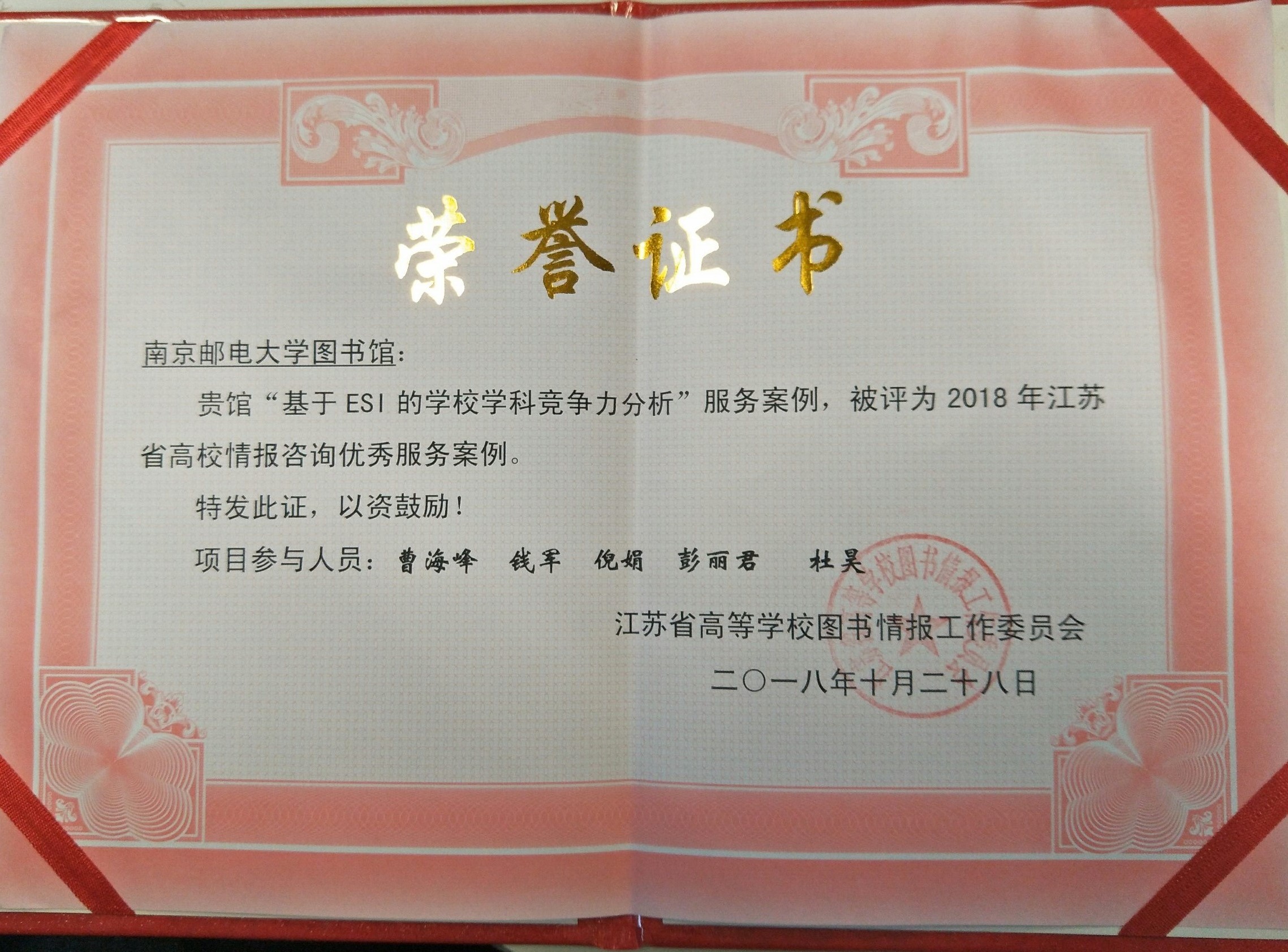 会上对江苏省高校图书馆情报咨询信息服务“优秀服务案例”进行了表彰,我馆“基于ESI的学校学科竞争力分析”服务案例被评为2018年江苏省高校情报咨询优秀服务案例。(曹海峰)