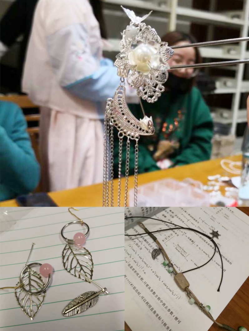 此次活动制作的灵感来源于《红楼梦》中的人物,制作内容包括发簪、手链、树脂泥人等。“风前横笛斜吹雨,醉里簪花倒著冠。”在社团潇湘馆馆主“修之”的带领下,大家沉浸其中,充分发挥自己的想象,力求做出优质的手工艺品,并共同设计红楼书偶。