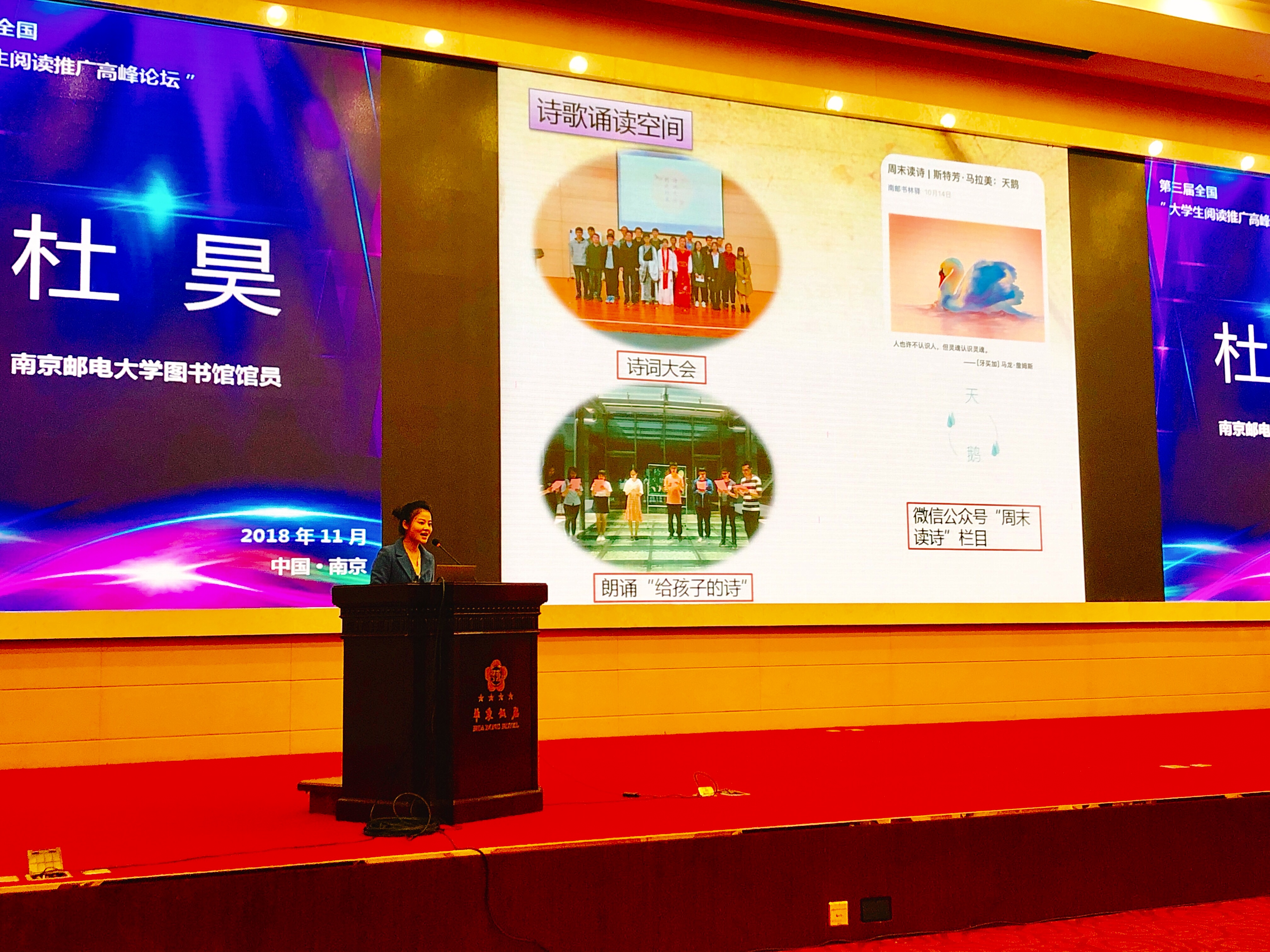 本次论坛旨在进一步交流大学生阅读推广经验,探索阅读推广的方法和路径,有效打造大学校园阅读空间,构建校园阅读共同体,形成大学校园阅读推广的合力,促进大学校园阅读推广常态化建设。论坛包括主旨报告、专家报告、案例交流等环节。在案例交流环节中,我馆杜昊老师代表南邮图书馆作了题为《强化特色阅读空间建设,促进校园阅读推广——南京邮电大学图书馆优化阅读空间建设》的案例分享。