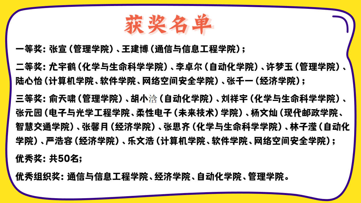 本次大赛共颁出个人奖项67名,其中一等奖2名,二等奖5名,三等奖10名,优秀奖50名, 4个学院荣获“优秀组织奖”。