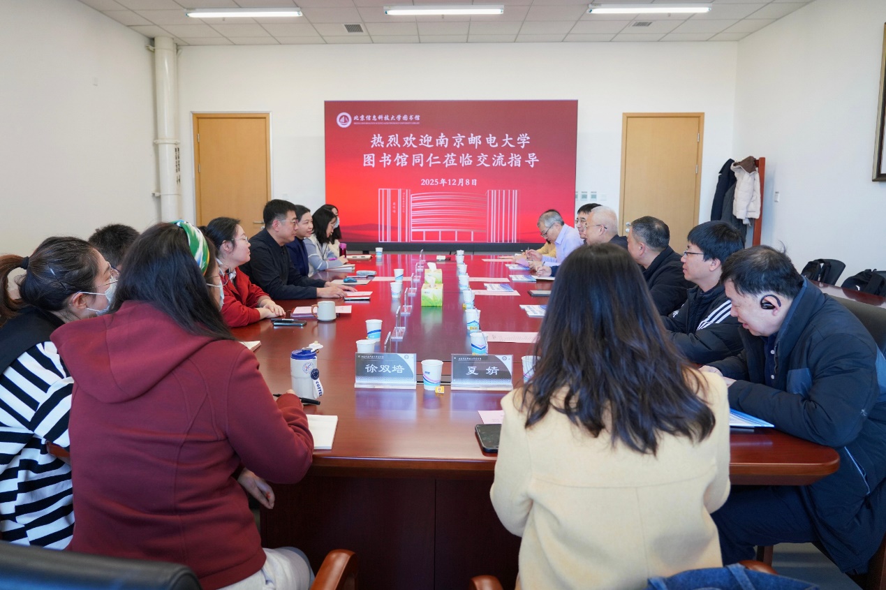 随后,双方来到北邮图书馆举行座谈。邱雪松馆长介绍了北邮图书馆总体情况,并围绕智慧图书馆规划、情报分析服务、文化育人等主题进行了详细阐述。双方还就“十五五”规划编制、信息化运维、馆员考核等共同关心的问题展开了深入探讨。北京邮电大学图书馆副馆长王楠、李忠庆及相关部室负责人参与交流。