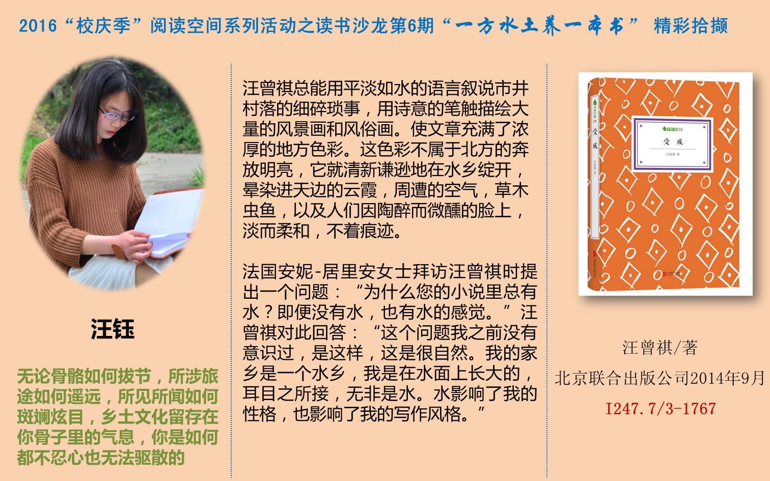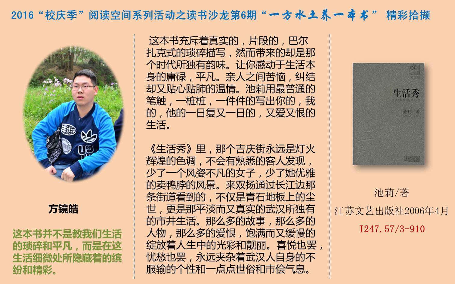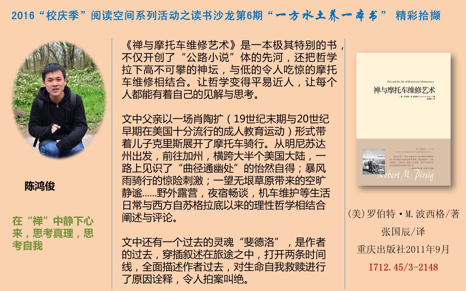 陈鸿俊同学首先介绍了自己阅读《禅与摩托车维修艺术》一书的感受,该书讲述了作者骑摩托车载着儿子,横跨美国大陆,探寻现代文明下科技与艺术的关系,探索自我心灵与人类文明的故事。紧接着,汪钰同学介绍了汪曾祺的《受戒》一书,那“水一般的文字,水一样的性格”虽平淡,却抓住人心。最后,方镜皓同学围绕武汉本土作家池莉的《生活秀》一书,将他所生活的城市武汉,一幅“三面环山,一面临江”,日落前往门口洒水纳凉的独具特色市井小民的家庭生活画面,活灵活现的展现给大家。