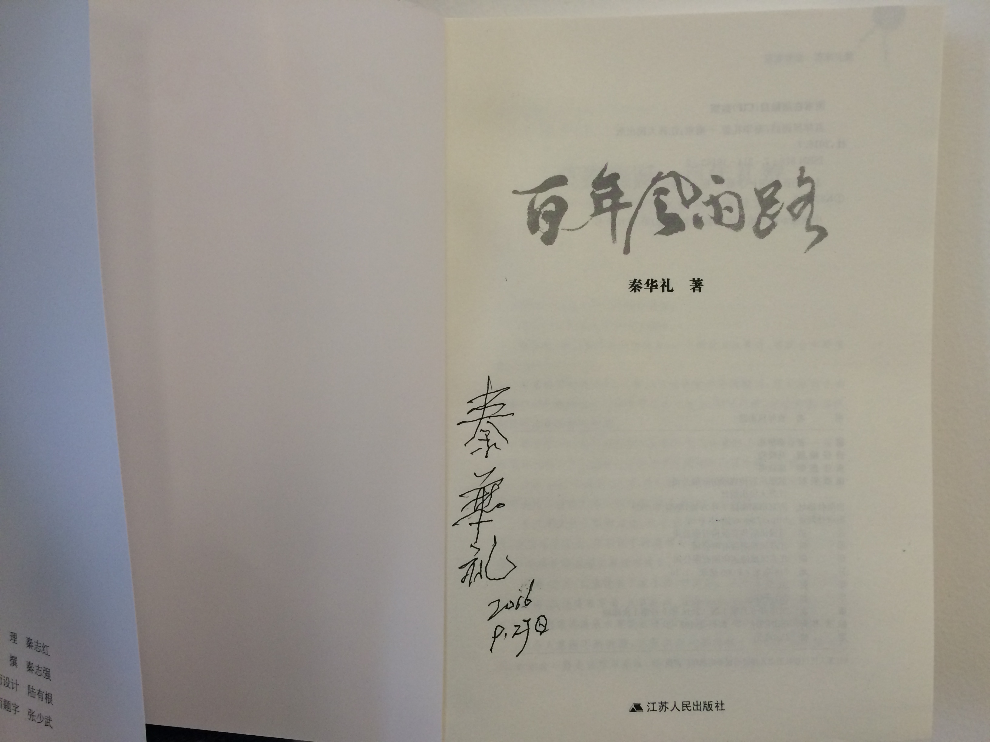2016年9月30日,南京邮电大学图书馆馆长钱军和文献建设部主任张建芬拜访了南京邮电大学首任书记、104岁的老红军秦华礼。秦书记将亲笔签名的回忆录《百年风雨路》(江苏人民出版社2016年9月)赠送给图书馆珍藏。“百年风雨路,尽付笑谈中”——这是秦老十分喜爱的一句话,也是他完成本书时心境的一种最为真实的写照。