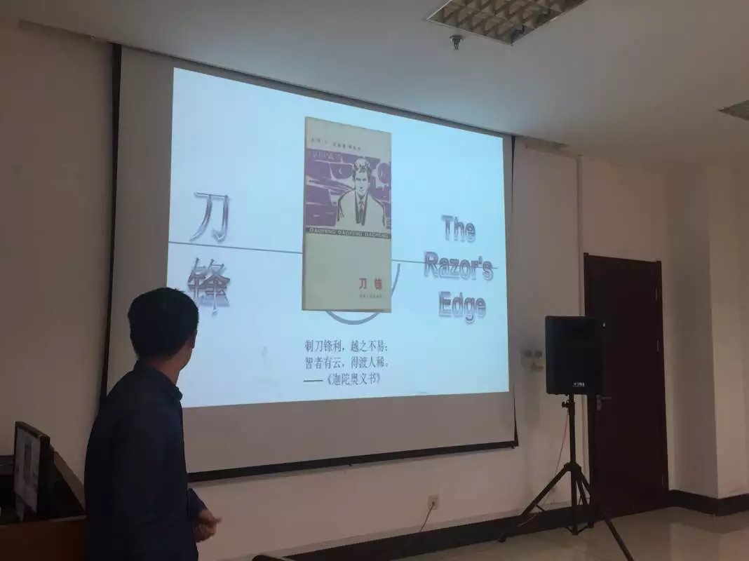 第二位主讲人陈鸿俊同学,介绍了英国作家毛姆的《刀锋》,向大家讲述了一个名叫拉里的年轻人,在人生道路上找寻自己的追求,逐渐脱离世俗的束缚。