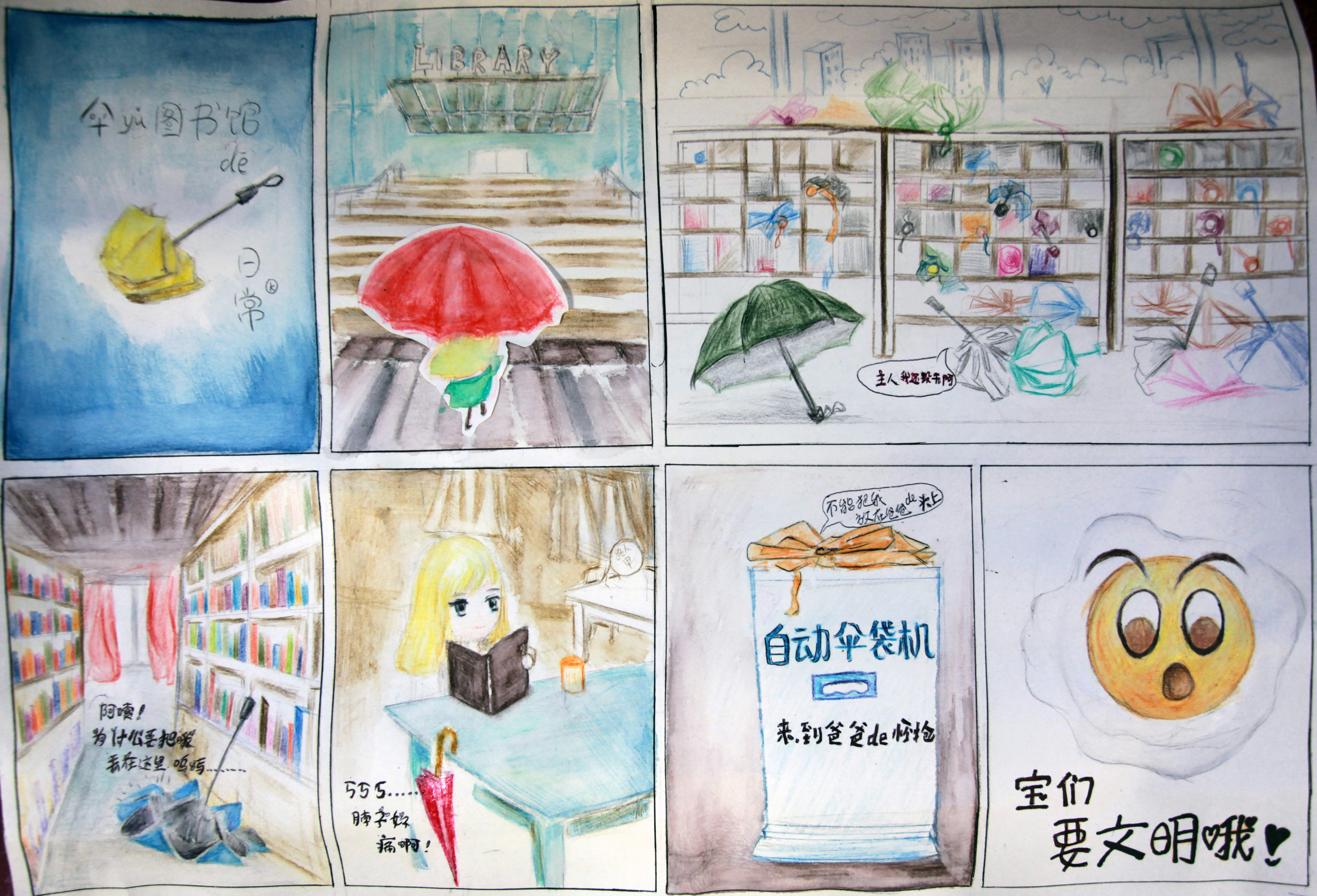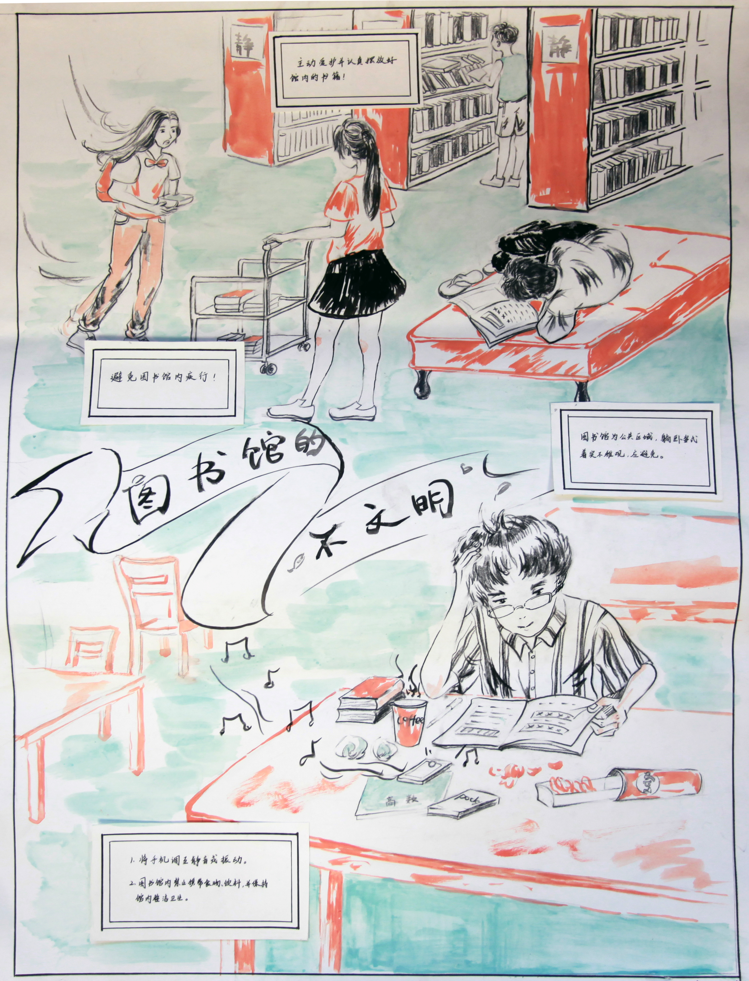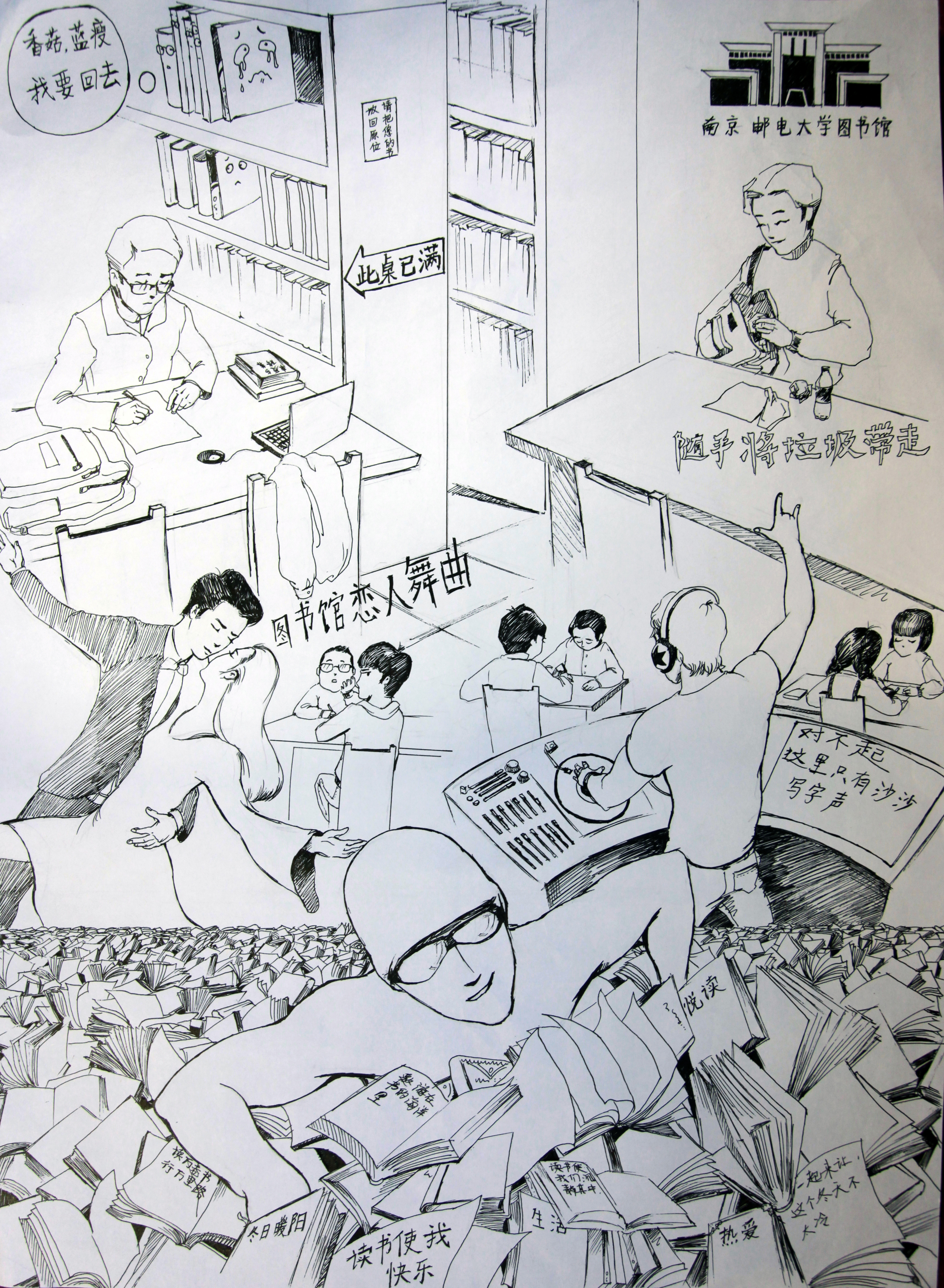 “物品占座”、“大声喧哗”… 不知道这些行为有没有出现在你的周围? 转眼又到了期末考试复习周,又是预习又是复习的节奏,图书馆以其充足的暖气,宽敞明亮的空间,倍受柚子们的欢迎,争做文明读者 杜绝不文明行为,共同建设和谐美好的阅览环境,2016年11月,由图书馆和传媒与艺术学院联合主办的冬日书画·读书漫画设计大赛产生了一系列丰富多彩的作品。共评选出一等奖1名、二等奖3名、三等奖5名、优秀奖12名,并在仙林图书馆二楼大厅举办“冬日书画”作品展,12月21日,工作人员在仙林校区图书馆展览现场,为此次活动中获奖的同学颁发获奖证书和奖品。
