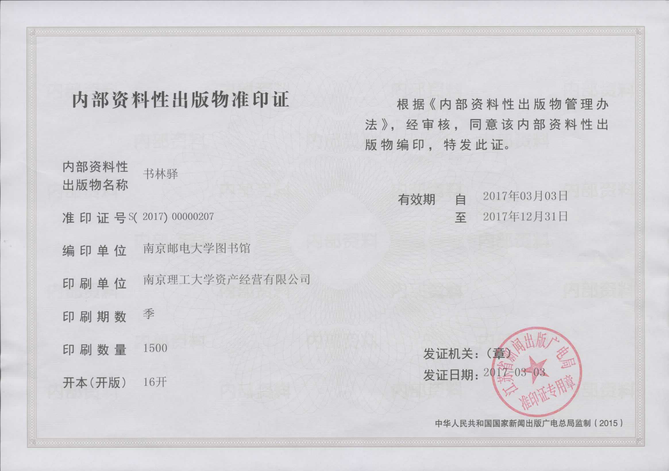 2017年3月,经江苏省新闻出版广电局审核,正式颁发“内部资料性出版物准印证”〔准印证号S(2017)00000207〕。