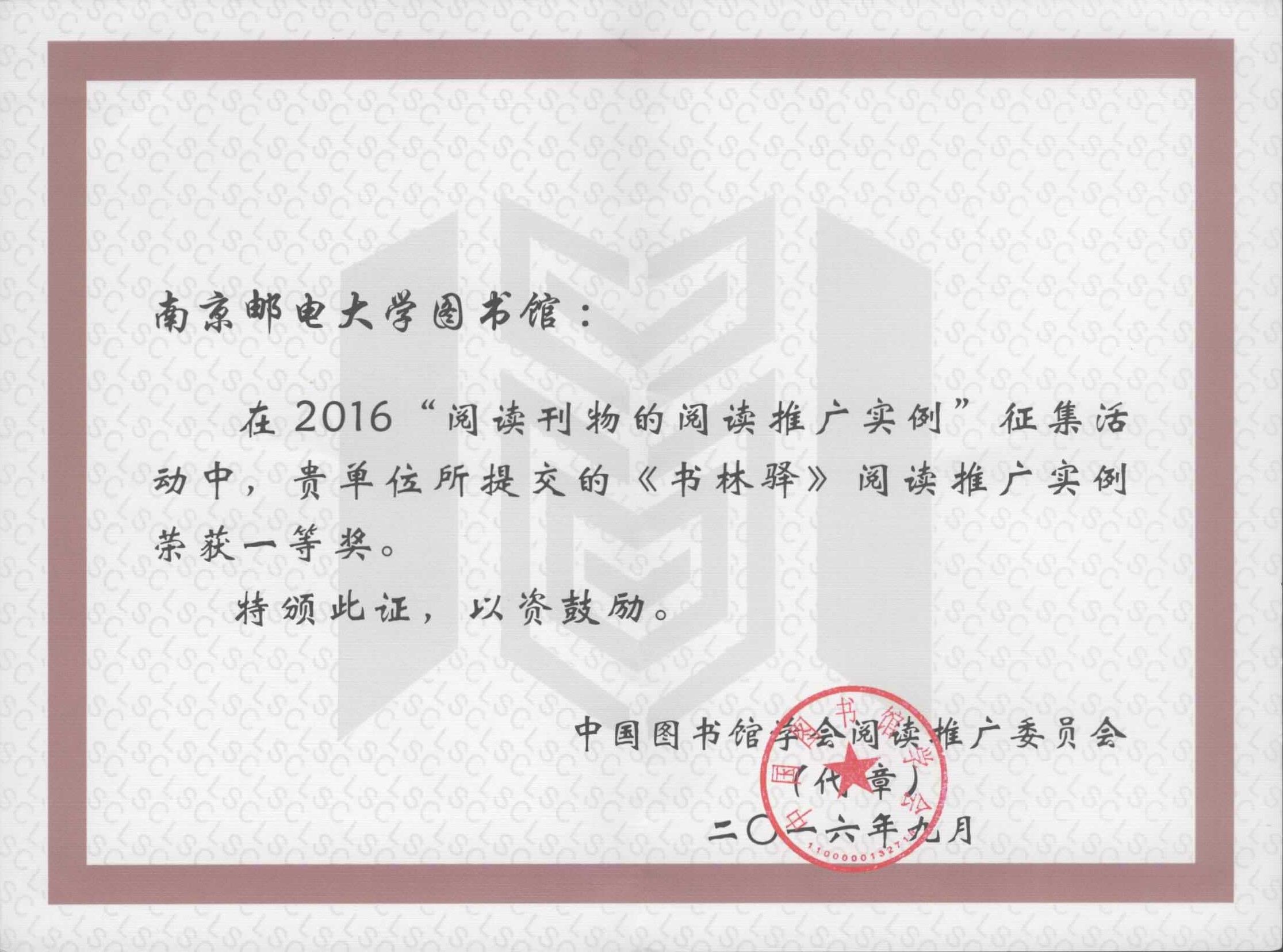 近日,由中国图书馆学会阅读推广委员会举办的2016“阅读刊物的阅读推广实例”征集活动评选结果出炉,我馆馆刊《书林驿》荣获一等奖。