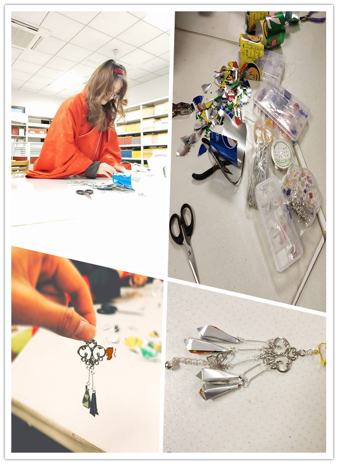 在仙林校区图书馆二楼经典阅读共享空间,上午由七醉阁古风社主持手工艺创作活动,古风社的王美钰带领大家将剪碎的易拉罐制作成首饰、挂饰等手工艺品。下午由金川书画社为大家讲书法,从书法的渊源讲到种类,更让大家临摹了一番,让热爱书法的同学们过了一把瘾。