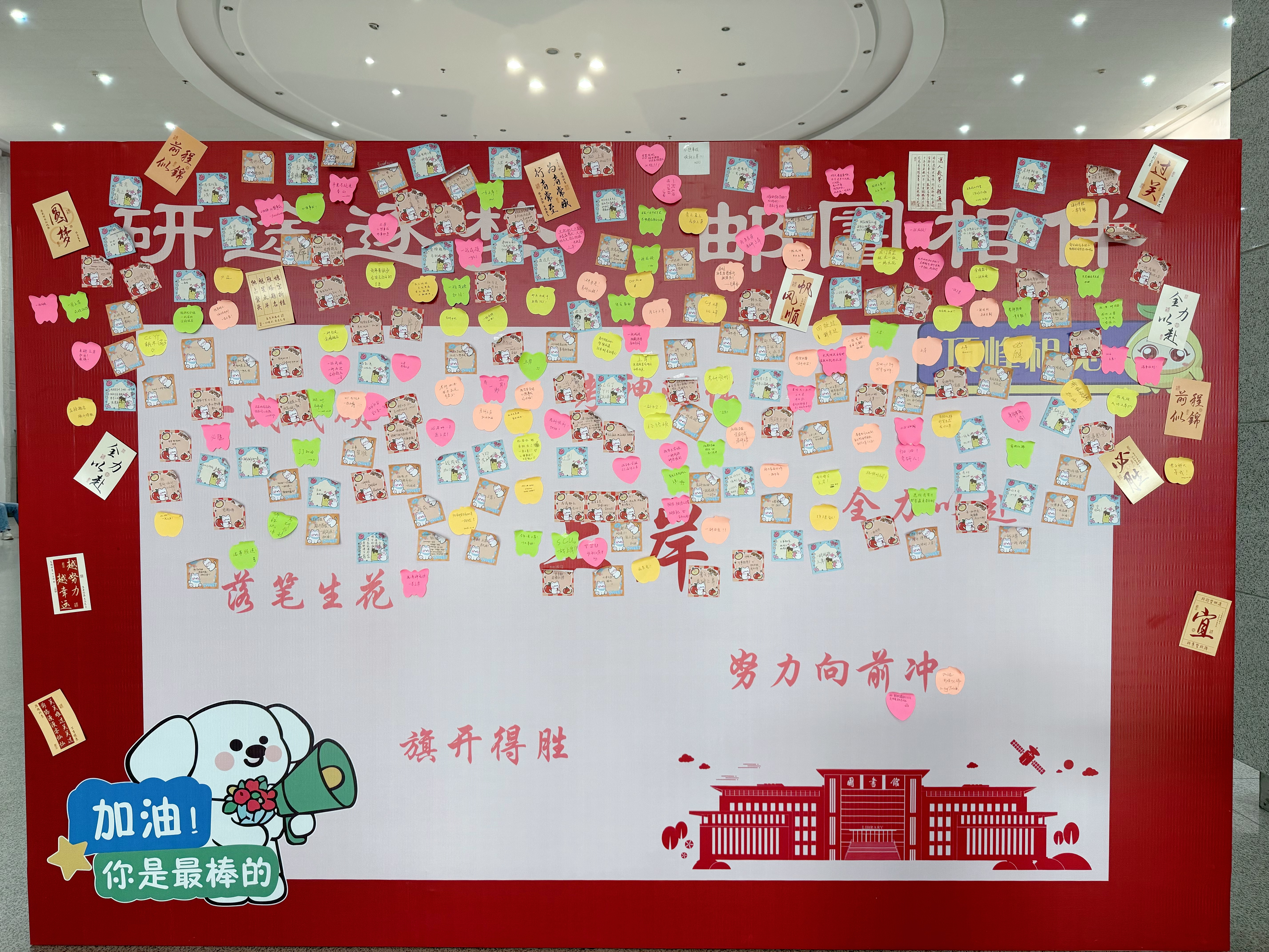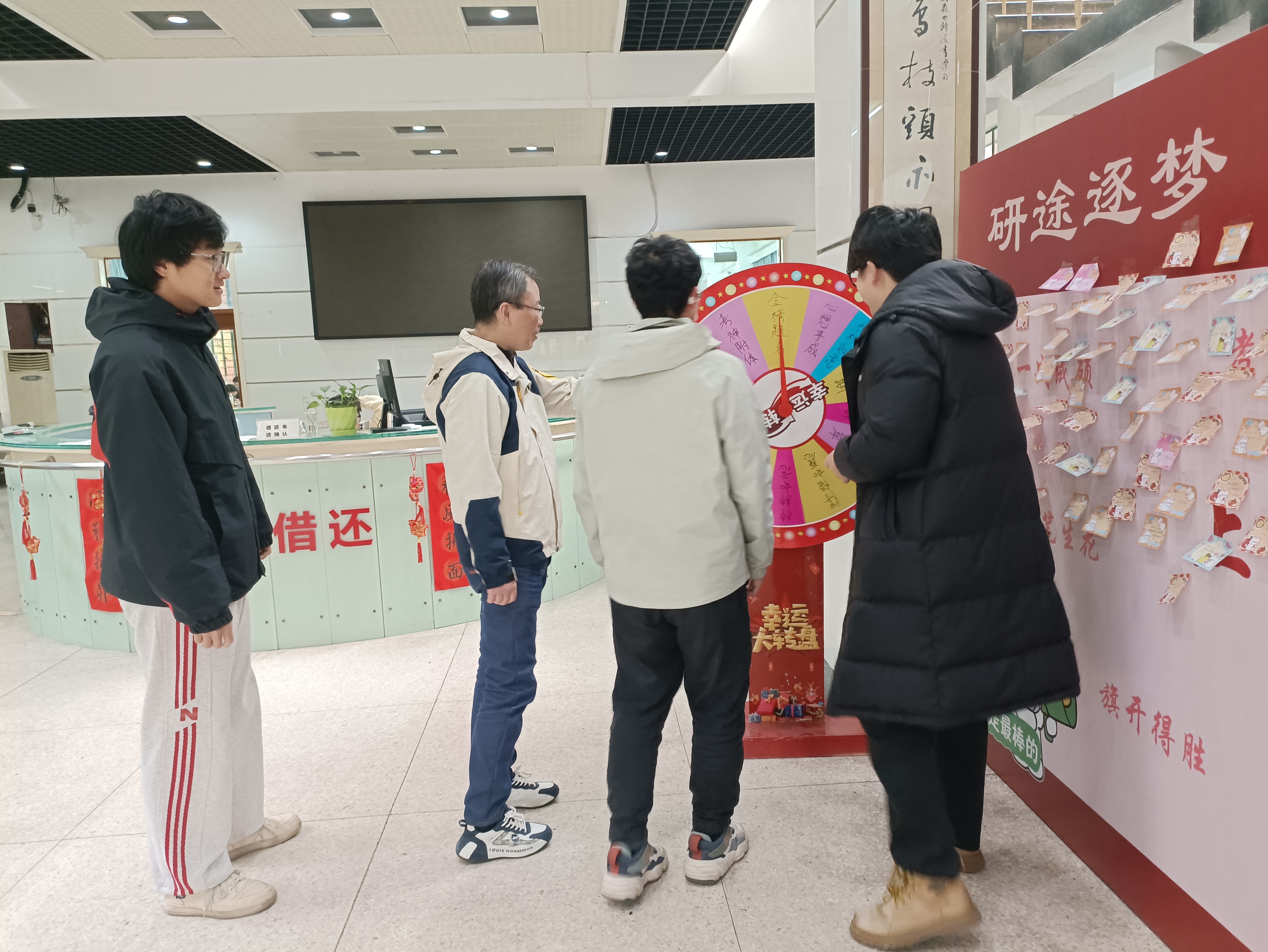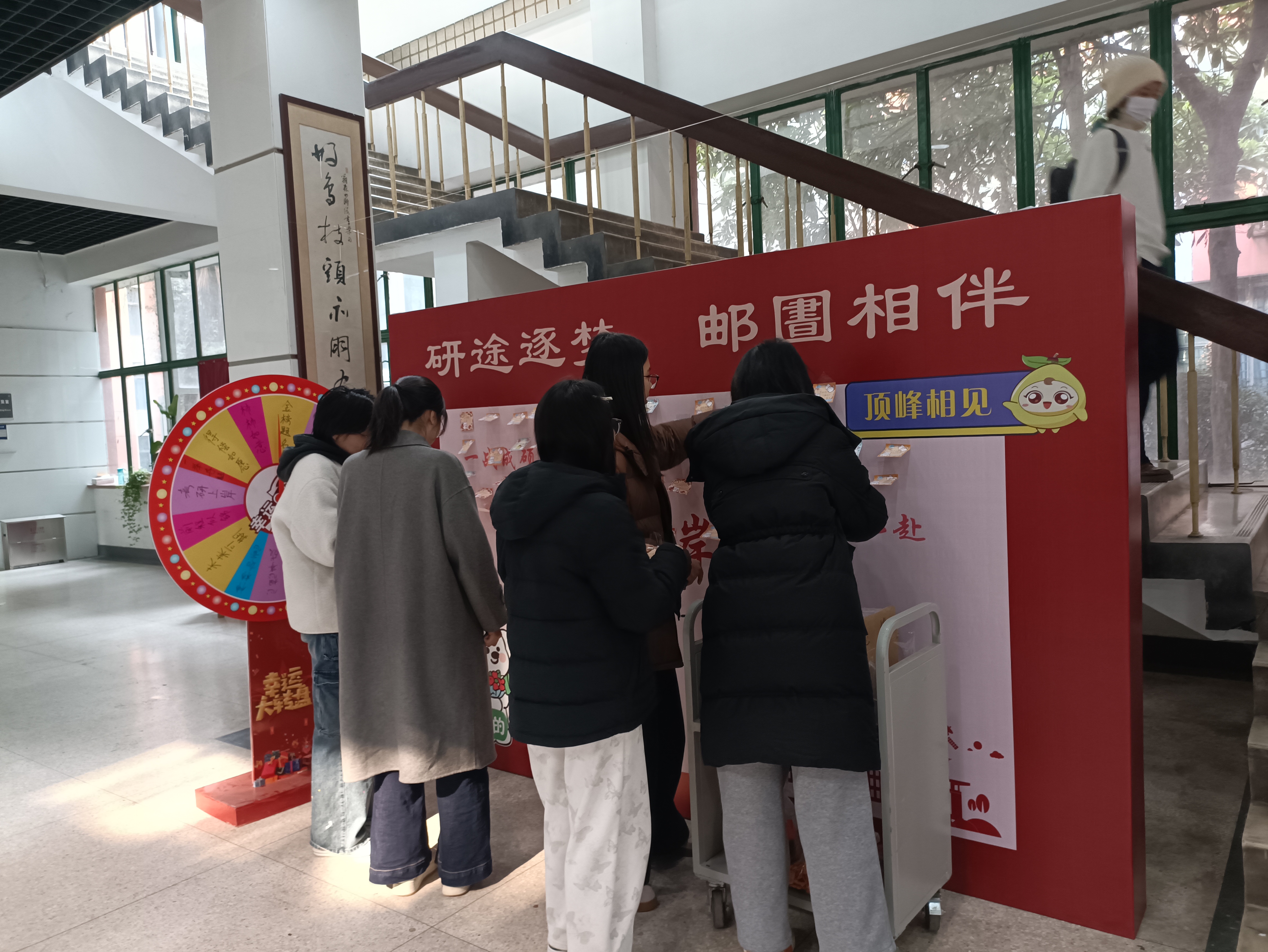 本次活动精心设置四大特色服务板块,精准赋能备考冲刺。两校区图书馆借还总台设立爱心服务站,全程值守提供文具、应急用品及实名领用耗材,及时解决学子备考中的突发需求;研途驿站内,学子们驻足停留,在金榜题名主题明信片上写下考研目标与心中期许,以笔墨寄初心,为逐梦之路定格信念;幸运加油站的幸运大转盘互动环节备受青睐,趣味抽奖为紧张的备考生活注入活力,进一步增强学子迎考底气;祝福许愿墙前,师生纷纷提笔写下暖心寄语,一句句真挚祝福汇聚成冬日暖流,让考研之路不再孤单。